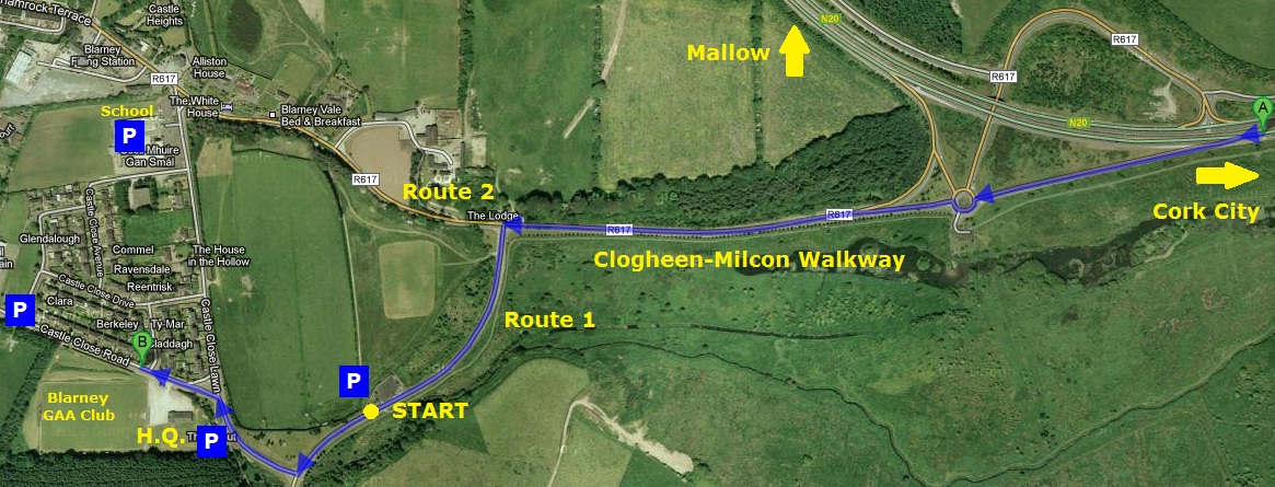 To get to the Blarney GAA Grounds, head out of Cork on the N20 (Mallow Road) and exit at the Blarney (R617) slip road at (A). Take the first left turn (Route 1) after the roundabout and follow the Clogheen-Milcon Walkway on your left. There’s a car park for users of the walkway about half way down this road at the START line. At the next junction turn right and then left to arrive outside the GAA Grounds at (B). There’s a small lay-by with limited parking facilities between these two junctions near the Scout Hall. There’ll also be limited parking inside and outside the GAA Grounds on Castle Close Road. There’s also plenty of parking in the Secondary School just off the R617. To arrive at the School, take the second left turn (Route 2) beyond the roundabout.