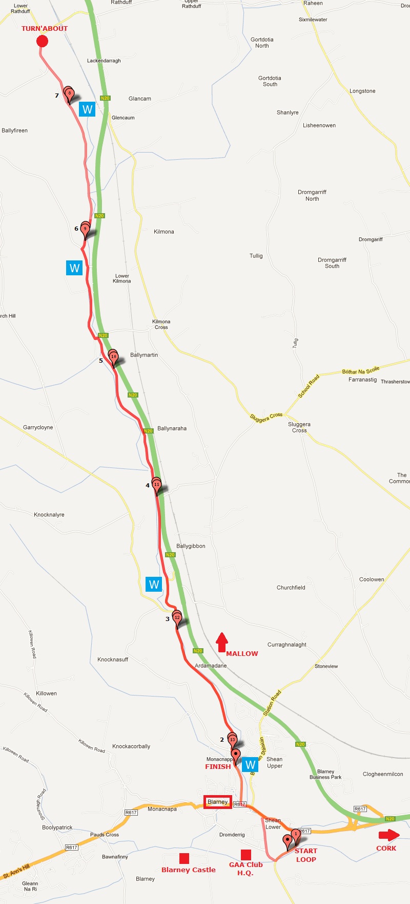 The beautiful wooded countryside just north of Blarney village provides a leafy backdrop for the Cork Half Marathon. No matter what the weather conditions, all this natural greenery makes for a very pleasant running experience. There’ll be five water stations in total – one at the FINISH and four out on the course. Two stations are passed twice en route for a total of seven water stops. Click on the Route Map above for details. The course itself runs northwards from Blarney past Waterloo, Monacnappa Estate and Lower Kilmona. For the most part, the route runs parallel to the N20 Cork-Mallow road, whose traffic can be heard in the background.