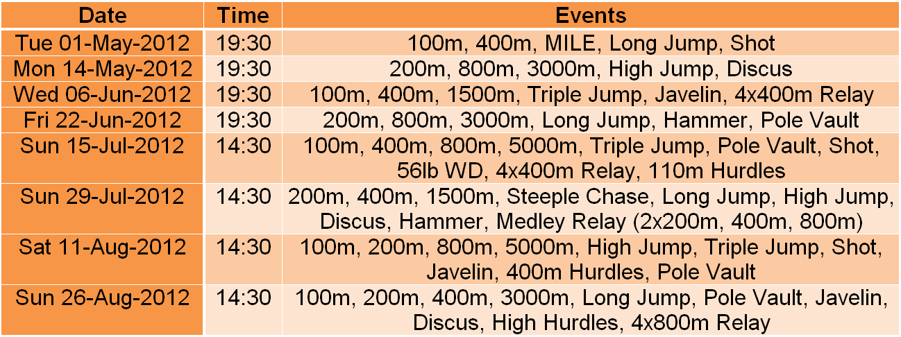 As the Mardyke is still under development, the venue for the Graded League of 2012 is the CIT track in Bishopstown. A programme of eight graded meetings is planned for male and female Athletes over 17 years of age on the day of completion (see table below). The Shot, Discus, Hammer and 56lb WD events are limited to athletes over 18 years of age on the day. Track events will if necessary be divided into separate races on the basis of performance, which could involve mixed participation.