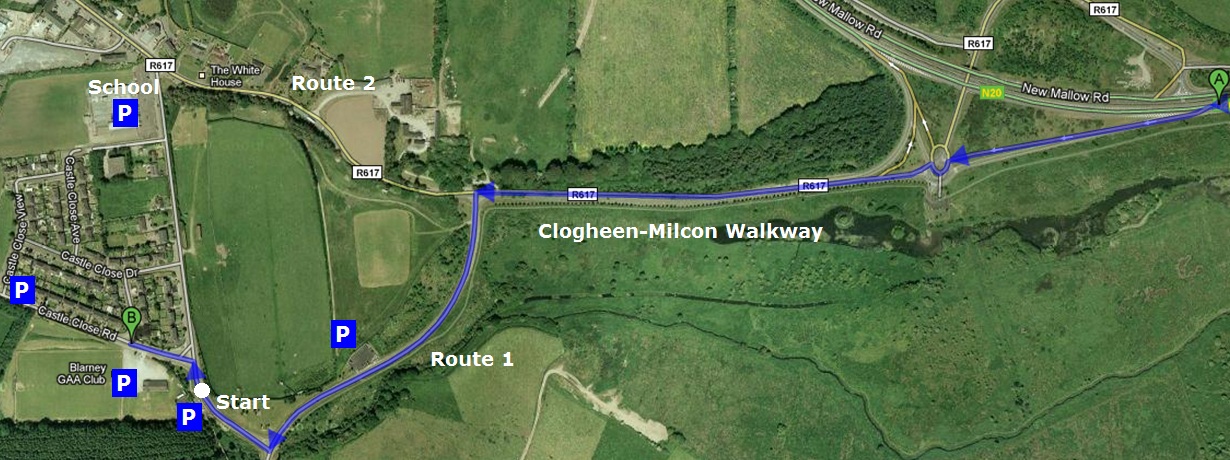 According to Google, the approach road, start road and lead-off road for this race are listed as “Unknown Roads”. I’ll have to check this out and get back to Google Maps. Anyway, to get to the Blarney GAA Grounds, head out of Cork on the N20 (Mallow Road) and exit at the Blarney (R617) slip road at (A). Take the first left turn (Route 1) after the roundabout and follow the Clogheen-Milcon Walkway on your left. There’s a car park for users of the walkway about half way down this road on the right. At the next junction turn right and then left to arrive outside the GAA Grounds at (B). There’s a small lay-by with limited parking facilities between these two junctions adjacent to the START line. There’ll also be limited parking both inside and outside the GAA Grounds on Castle Close Road, and there’s also parking available in the Scoil Mhuire Gan Smál secondary school just off the R617. To arrive at the school, take the second left hand turn (Route 2) beyond the roundabout.