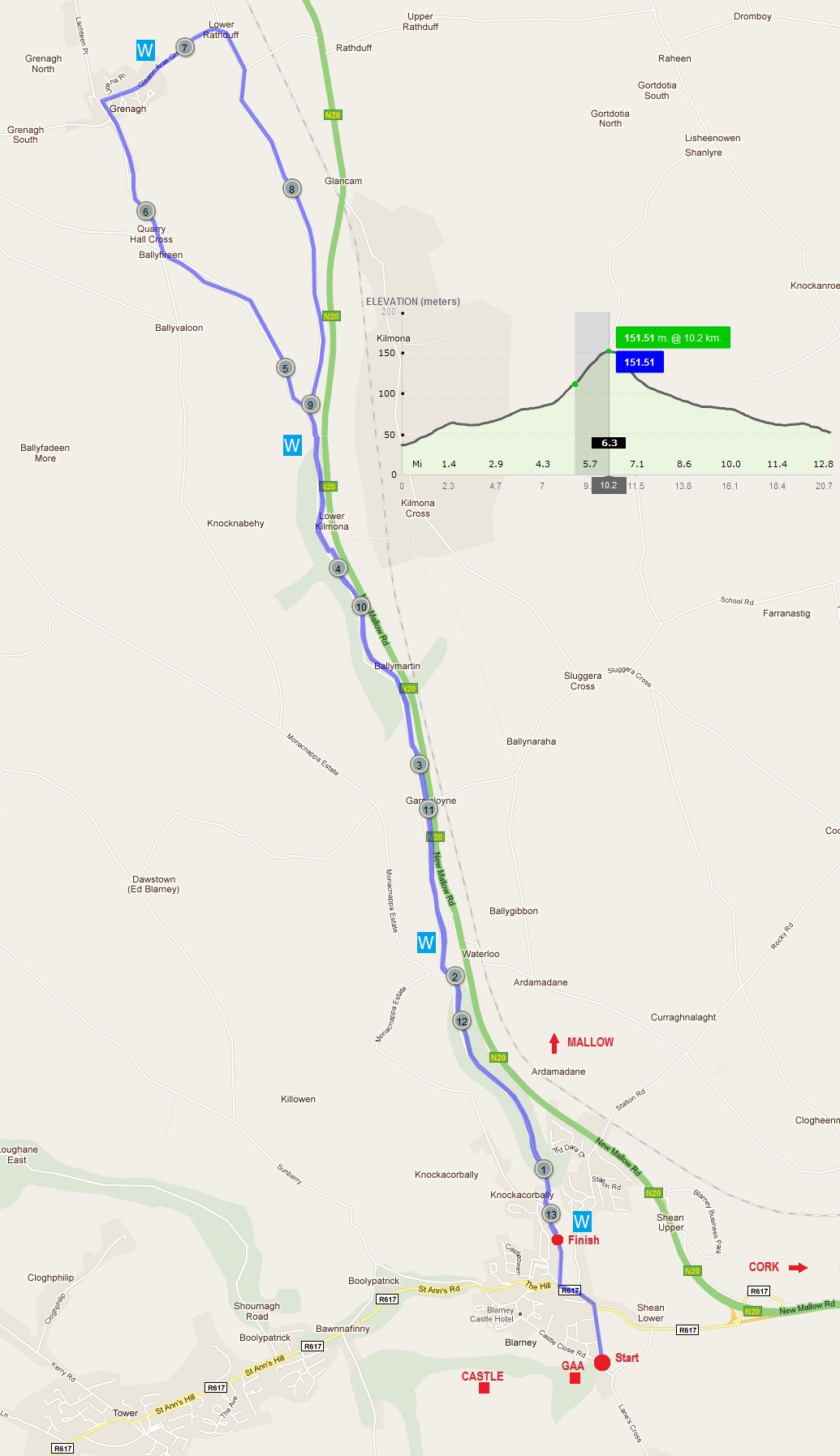 There’ll be four water station locations – one at the FINISH and three on the course. Two of the stations are passed twice along the way giving a total of six water stops. Click on the Route Map above for details. The course itself is like a giant paddle, the handle running northwards from Blarney past Waterloo, Monacnappa Estate and Lower Kilmona. For the most part, the route runs parallel to the N20 Cork-Mallow road, whose traffic can be heard in the distance. At about 4.7M, it loops clockwise around the blade, the tips of which comprise Genagh (6.5M) and Lower Rathduff (7.1M), before heading back down the handle to the FINISH on Waterloo Road. The race starts at a Y-Junction just outside and to the right of the GAA Grounds. You take the right fork up Castle Close Lawn past the secondary school and turn left past the garage with a slight pull up Shamrock Terrace before turning right onto Waterloo Road and the beginning of your hinterland odyssey.