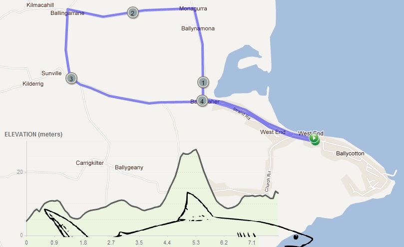 I’m sure the vast majority of you out there can find your way blindfold to Ballycotton. However, there are bound to be a few, like me, who’ve been up and down to Youghal for decades without ever turning left or right at Midleton. If you’re one of those intrepid few, welcome to pastoral East Cork and the Ballycotton 5M. You take the N25 Cork-Waterford road to the Midleton roundabout and exit southwards into uncharted territory. Veer left at Ballinacurra and take the R629 onwards to Cloyne. When you arrive in the centre of Cloyne, the R629 takes a left hand turn for Ballycotton, which is quite literally the end of the line for this stretch of road.