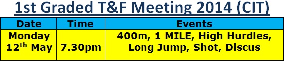 The John Buckley Track & Field League of 2014 kicks off at the CIT Track on Monday, May 12th, at 7.30pm. This is a programme of six graded meetings for Athletes male and female over 16 years on the day of competition; full details are available on the Cork AAI website. These graded meetings are open to athletes of all levels of ability.