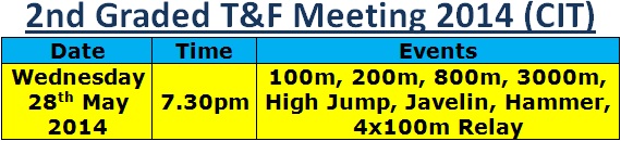 The second John Buckley Sports T&F Meeting of 2014 kicks off at the CIT Track on Wednesday, May 28th, at 7.30pm. This is a programme of six graded meetings for Athletes male and female over 16 years on the day of competition; full details are available on the Cork AAI website. These graded meetings are open to athletes of all levels of ability.