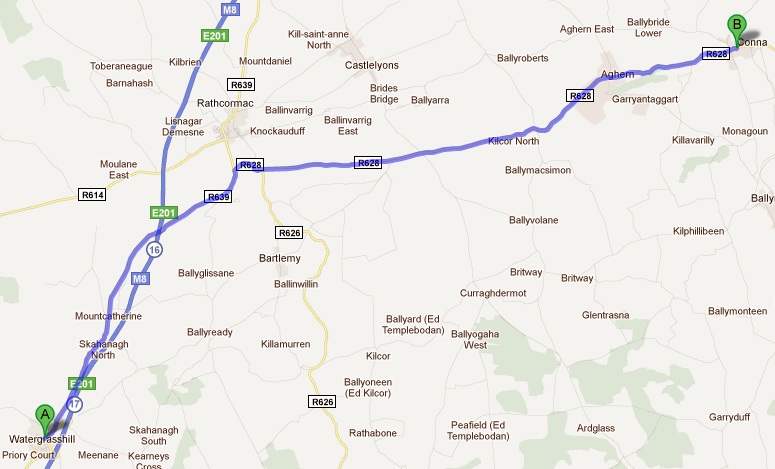 To get to Conna, make your way to the Dunkettle roundabout via the Tunnel or the Lower Glanmire Road and head north for Dublin. Exit the motorway at Watergrasshill before you reach the Toll Plaza. Go through the village and head north for Rathcormac on the old Dublin (N8/R639) Road. About 1km before you enter Rathcormac, turn right onto the R628 heading east for Tallow. Conna is about 12.5km down the road or 20km from Watergrasshill. The turnoff for the Cross Country venue will be signposted before you get to Conna village.